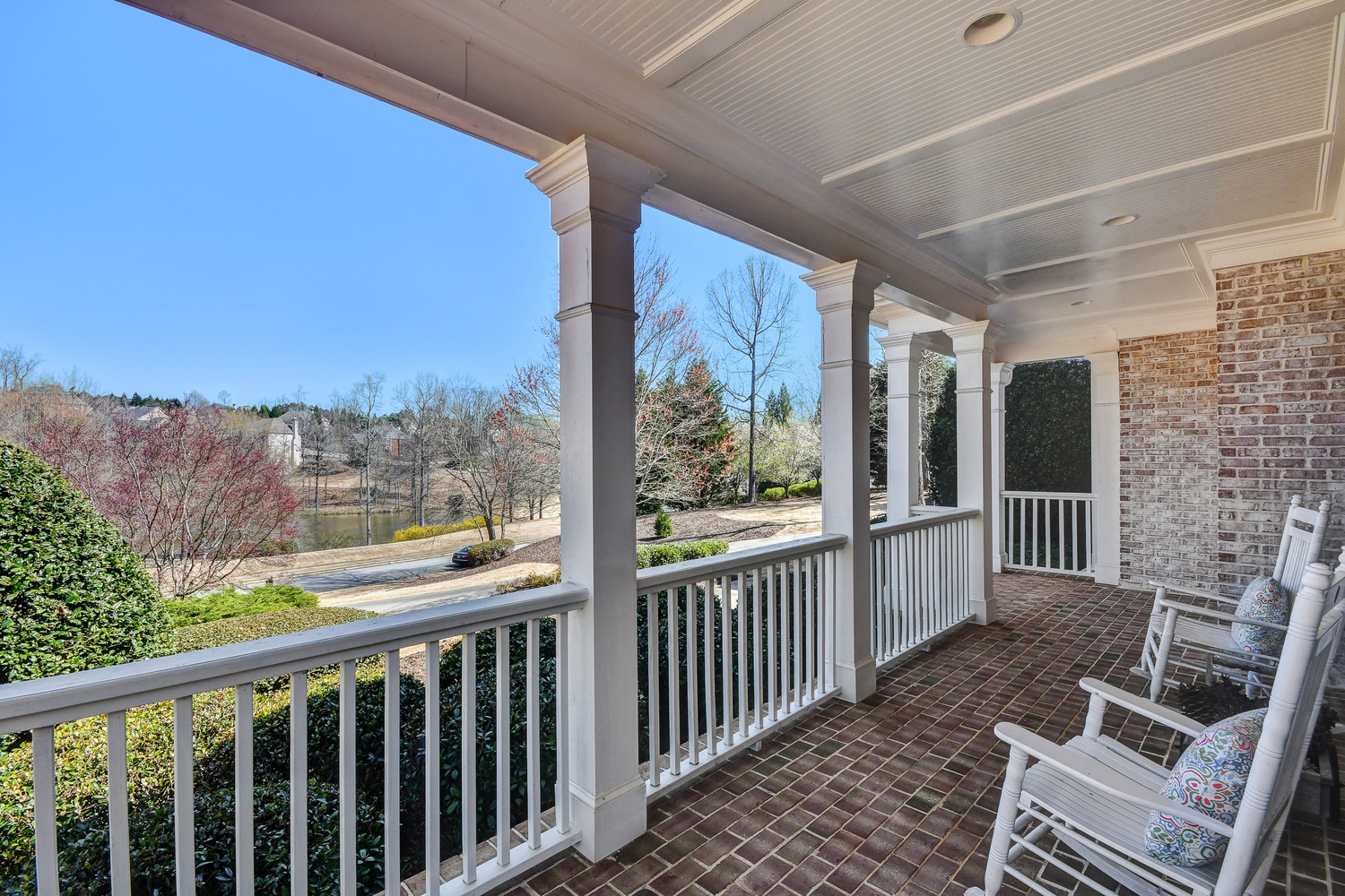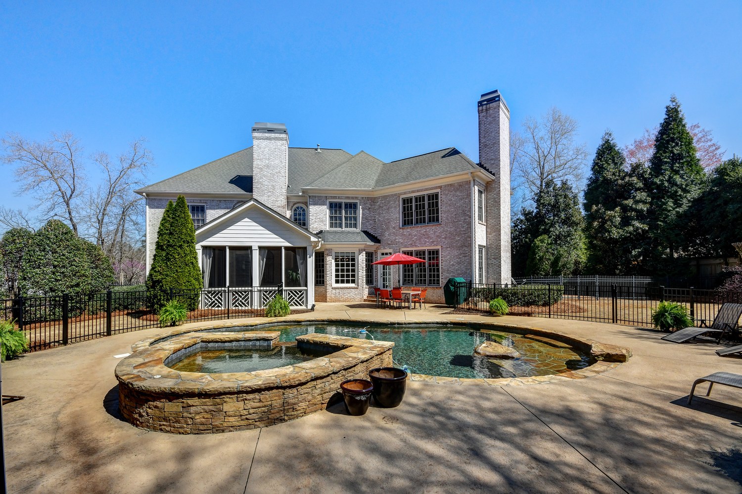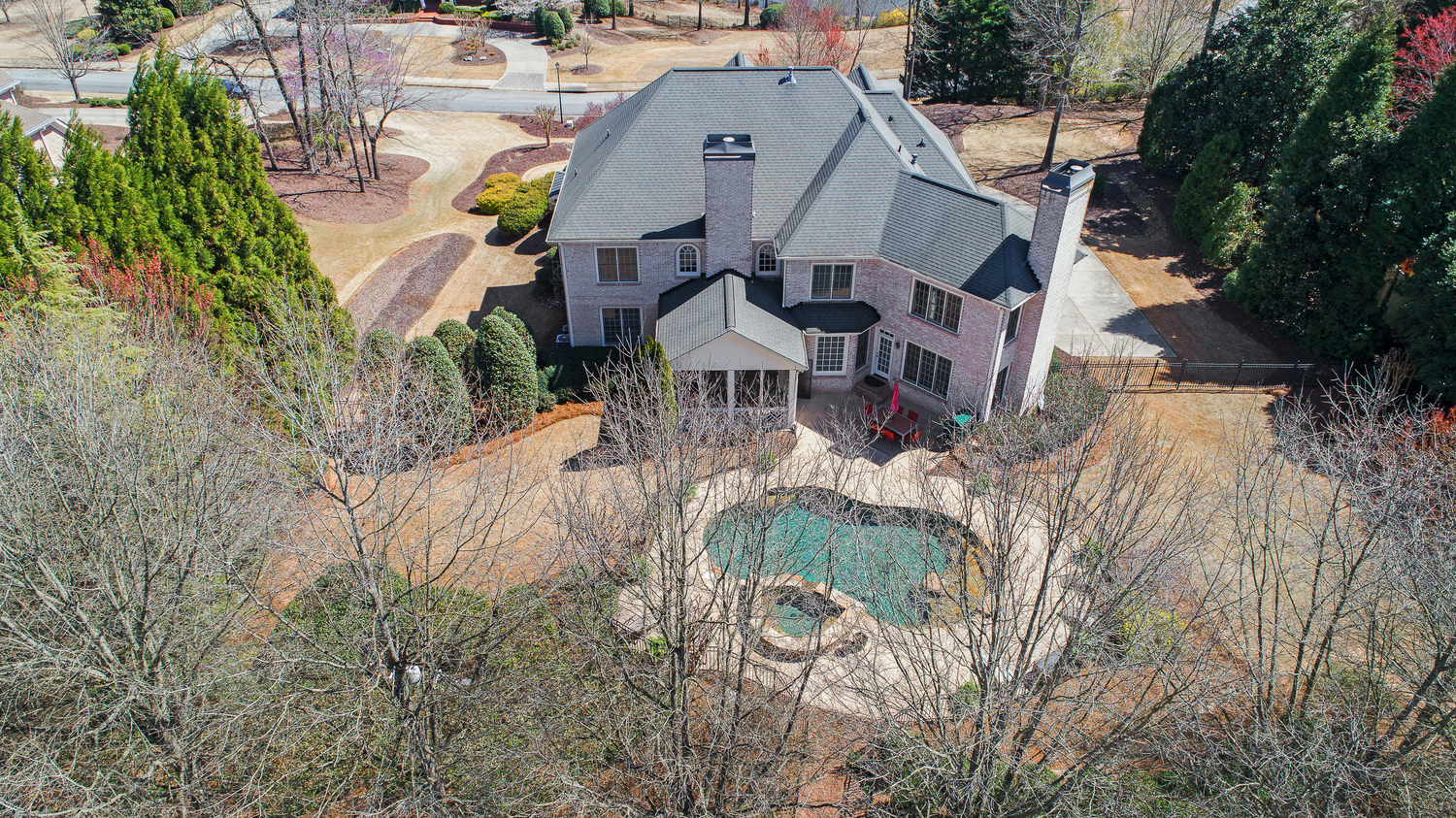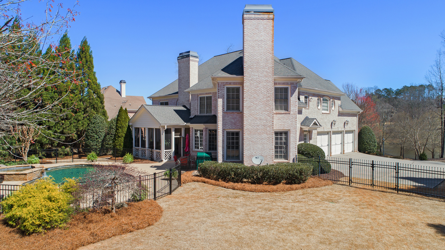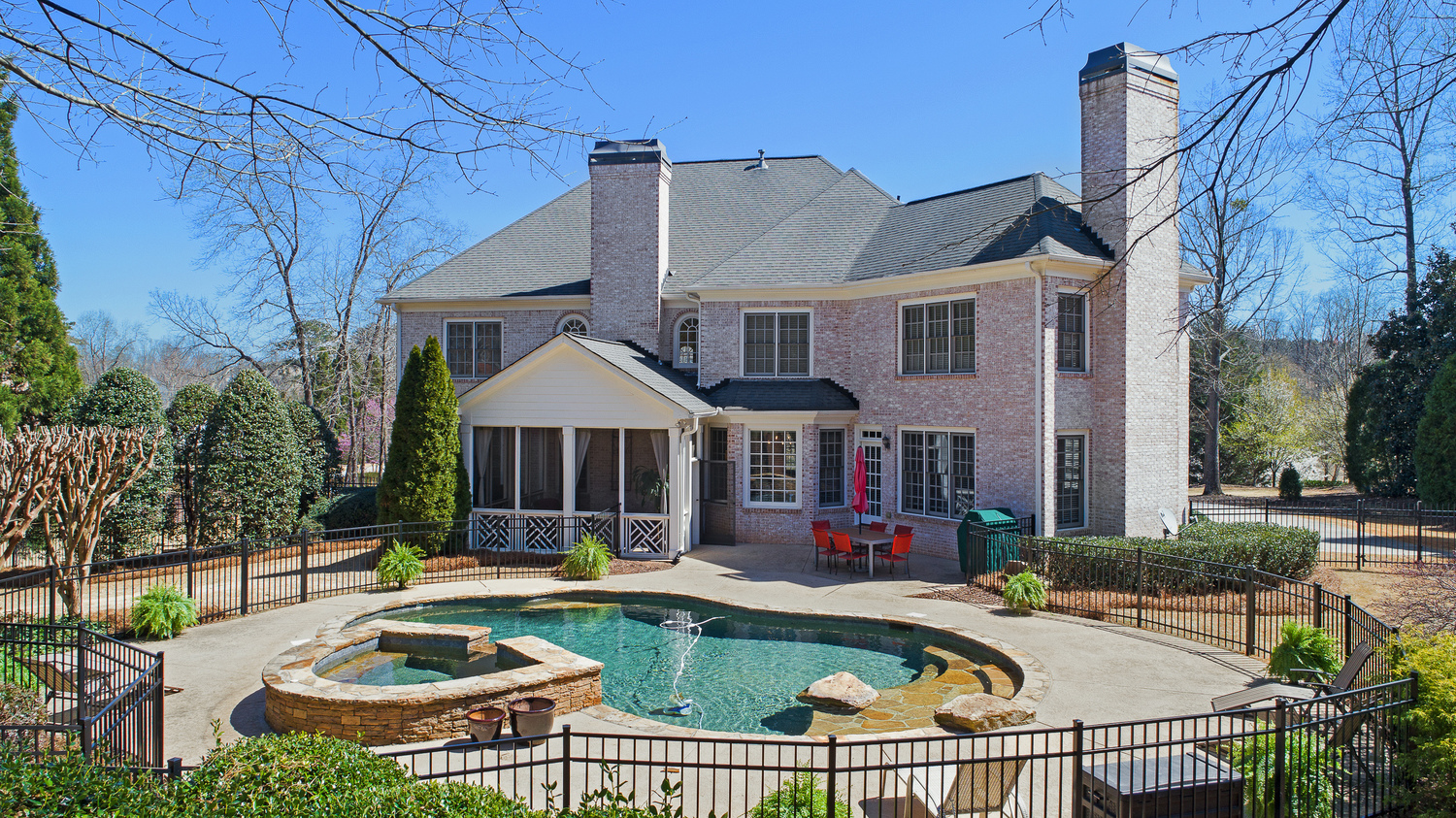 Elegance abounds in this 5 bed/5 bath, 4-sides brick estate in guard gated White Columns. Salt water heated Pebble Tec pool in fenced backyard. Gorgeous view of horse farm behind house. Walk out b'yard, large screened patio, huge open kitchen, fireside keeping rm. Guest ste on main. All hardwoods on main. Oversized master w/stone fireplace overlooking flat backyard. Large master spa w/custom his/her walk-in closets.Fin basement boasts game rm, movie rm, full bath, potential 6th bedrm. Whole-house audio throughout all 3 levels.200' fenced dog run. Top schools