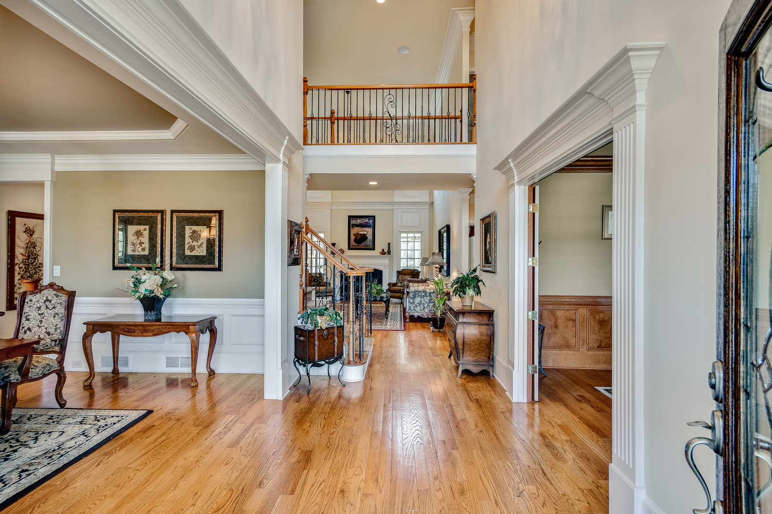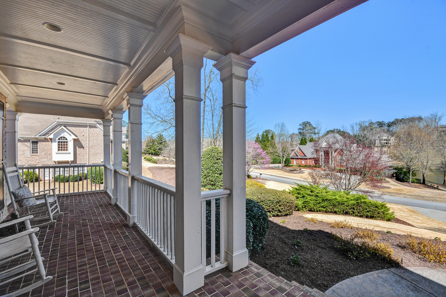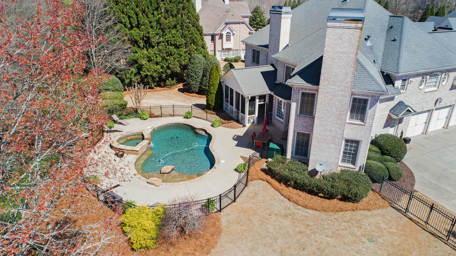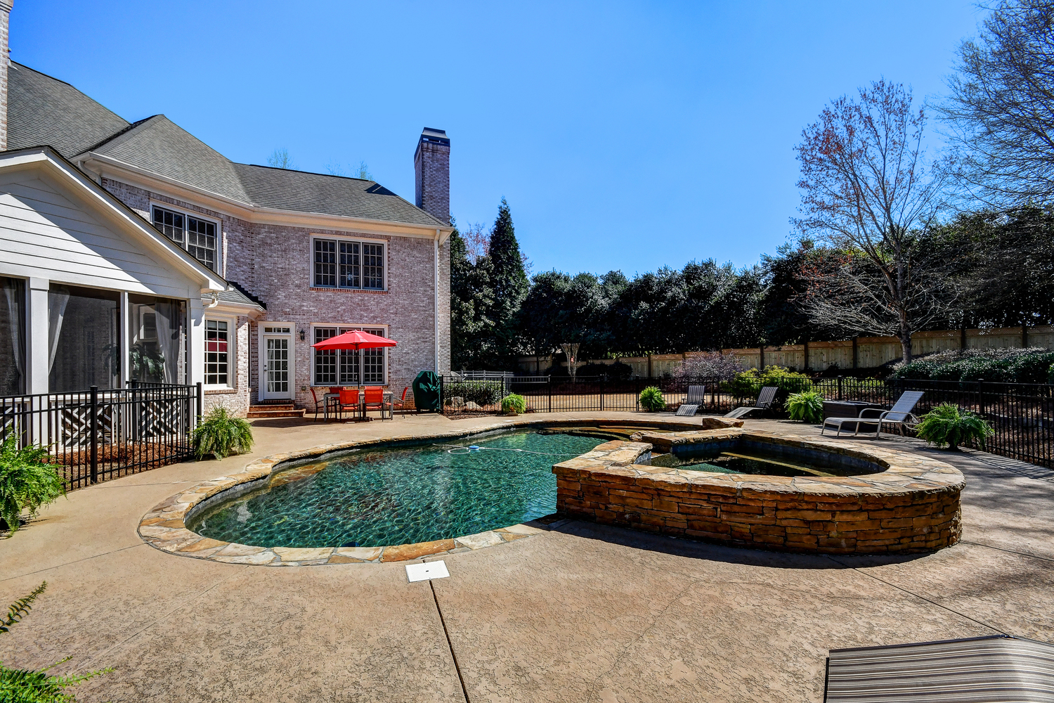 Elegance abounds in this 5 bed/5 bath, 4-sides brick estate in guard gated White Columns. Salt water heated Pebble Tec pool in fenced backyard. Gorgeous view of horse farm behind house. Walk out b'yard, large screened patio, huge open kitchen, fireside keeping rm. Guest ste on main. All hardwoods on main. Oversized master w/stone fireplace overlooking flat backyard. Large master spa w/custom his/her walk-in closets.Fin basement boasts game rm, movie rm, full bath, potential 6th bedrm. Whole-house audio throughout all 3 levels.200' fenced dog run. Top schools