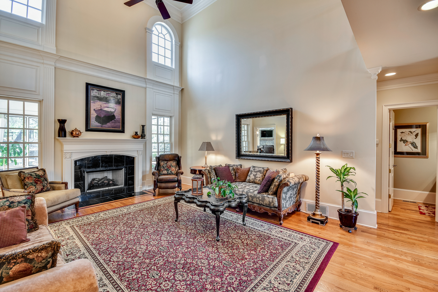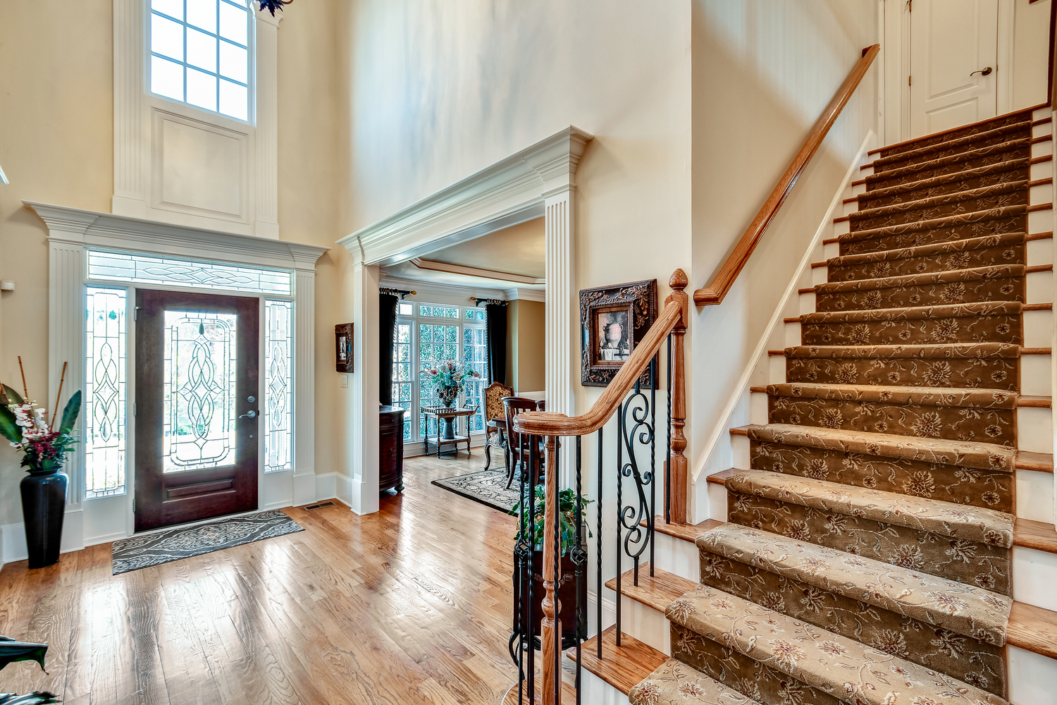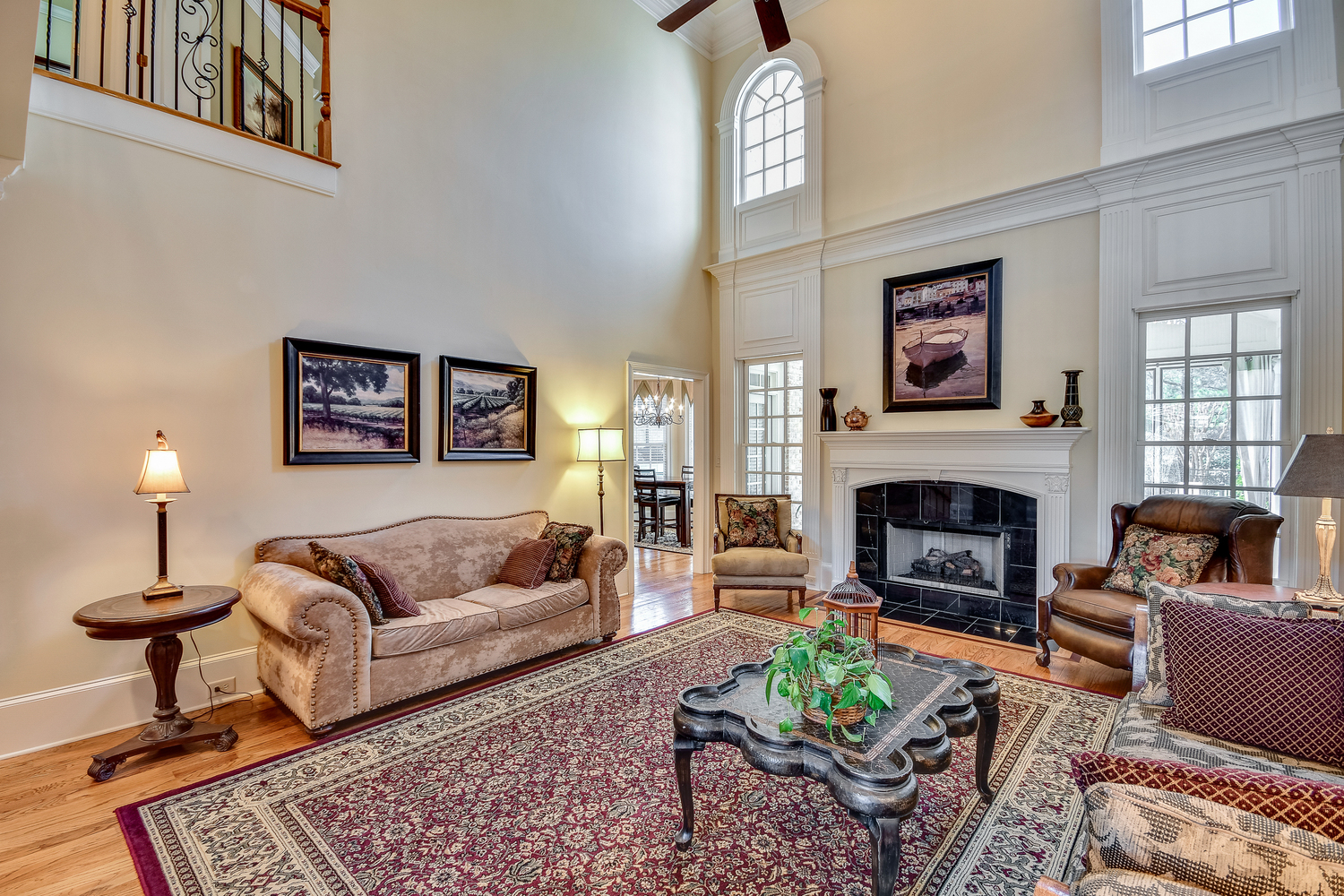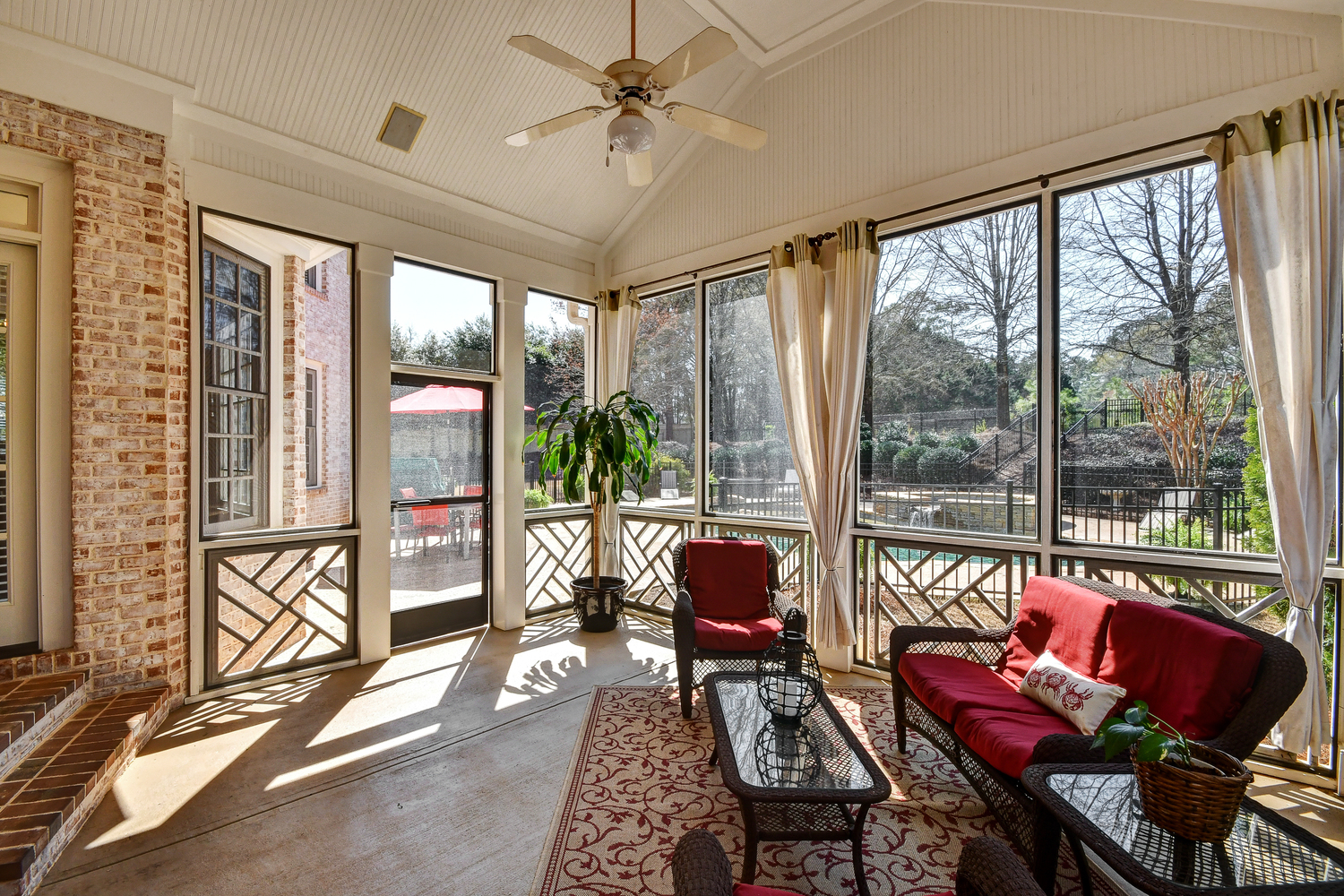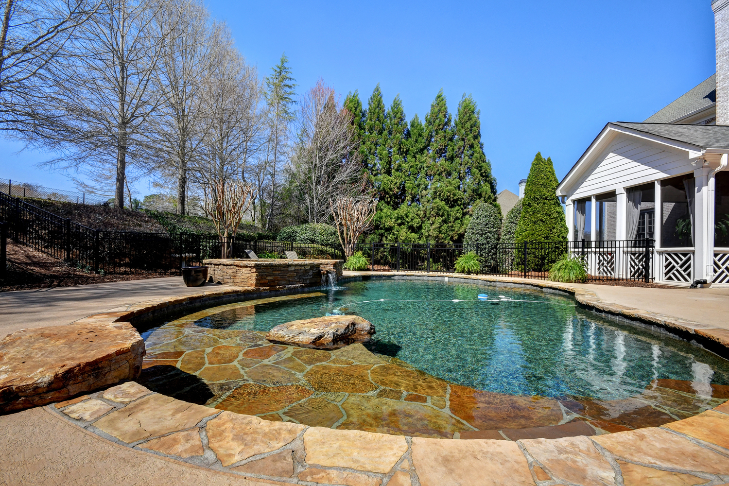 Elegance abounds in this 5 bed/5 bath, 4-sides brick estate in guard gated White Columns. Salt water heated Pebble Tec pool in fenced backyard. Gorgeous view of horse farm behind house. Walk out b'yard, large screened patio, huge open kitchen, fireside keeping rm. Guest ste on main. All hardwoods on main. Oversized master w/stone fireplace overlooking flat backyard. Large master spa w/custom his/her walk-in closets.Fin basement boasts game rm, movie rm, full bath, potential 6th bedrm. Whole-house audio throughout all 3 levels.200' fenced dog run. Top schools